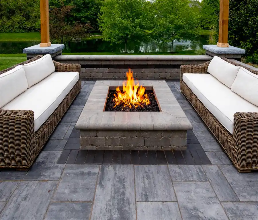 Traditions Landscape Group creates a sophisticated outdoor living space with a custom blend of Unilock pavers, focusing on durability and refined aesthetics.