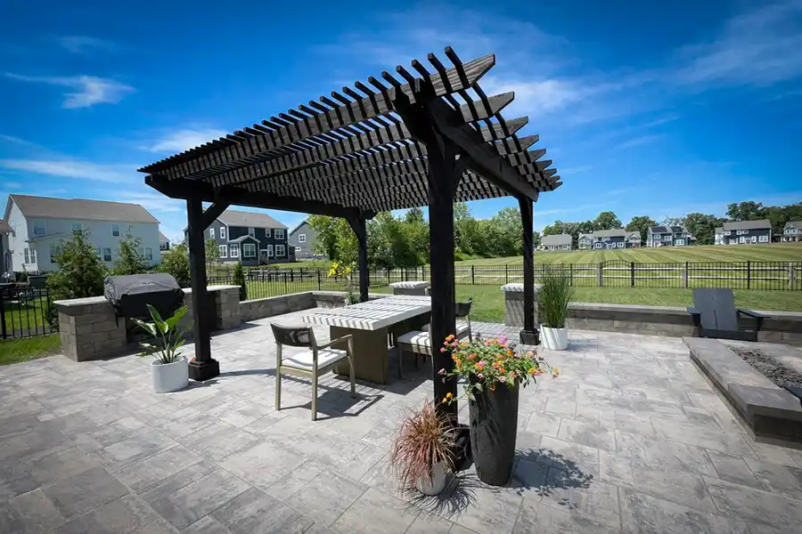 This New Albany, Ohio, project by Traditions Landscapers features a premium Unilock Beacon Hill paver patio topped with a handcrafted custom cedar pergola. The luxury outdoor living space integrates a granite-countertop grill island, a cozy gas fire pit, and sitting walls, creating a functional, high-end retreat perfect for relaxation and effortless entertaining.