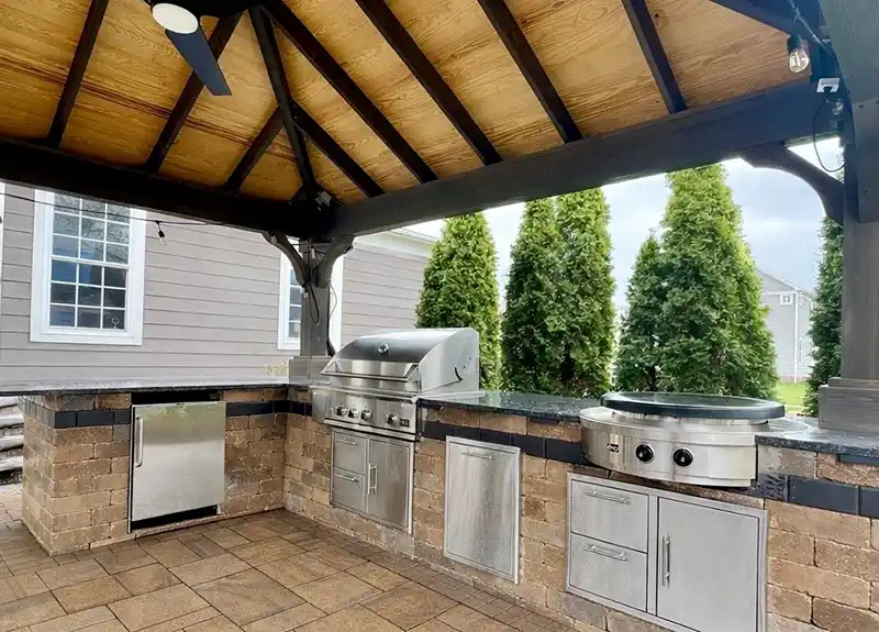 Transform your backyard with a Unilock Beacon Hill Sierra paver patio, Berlin Cascade pavilion, and outdoor kitchen featuring BBQ Guys built-in grill, griddle, fridge & granite countertops.